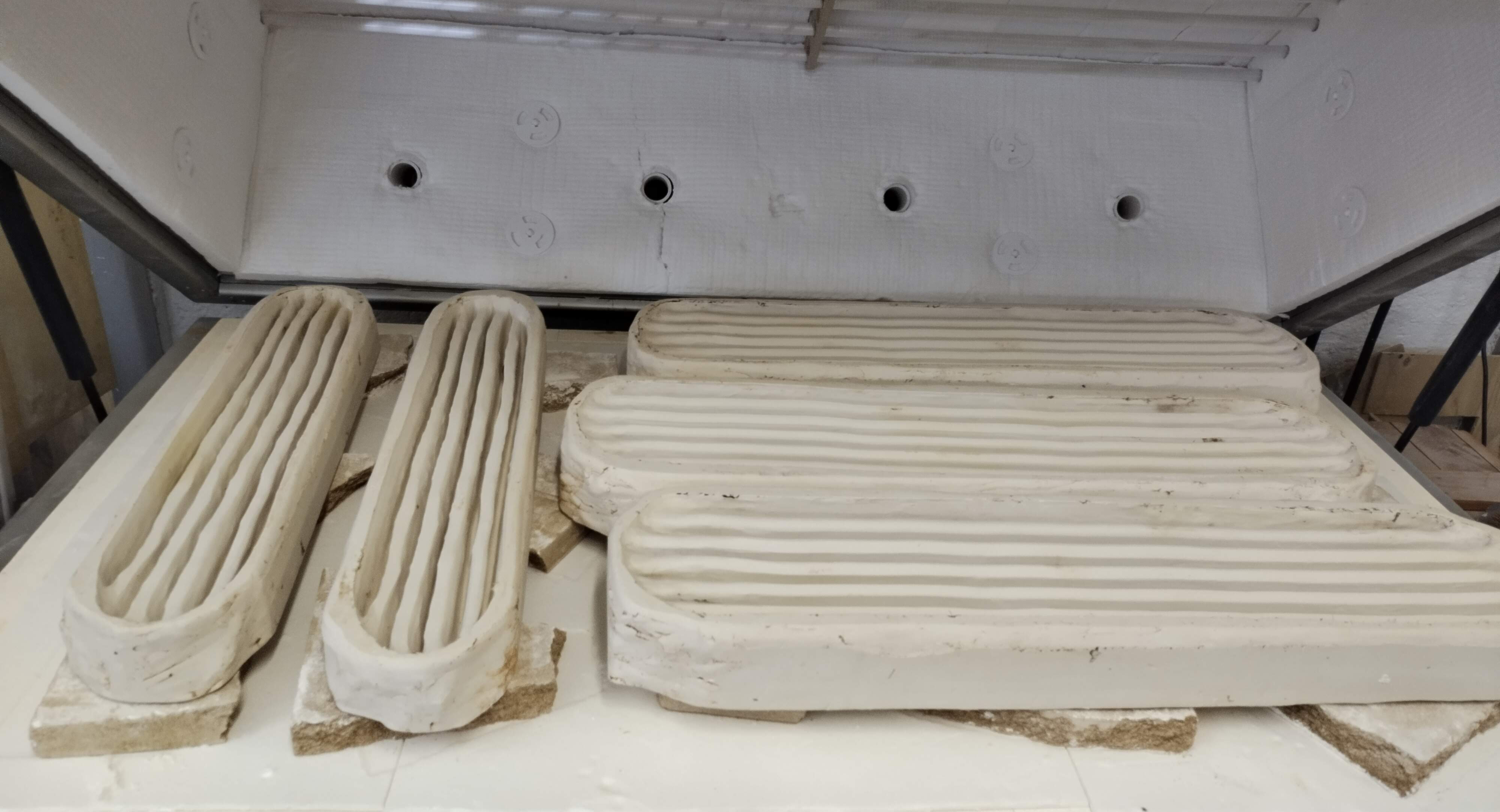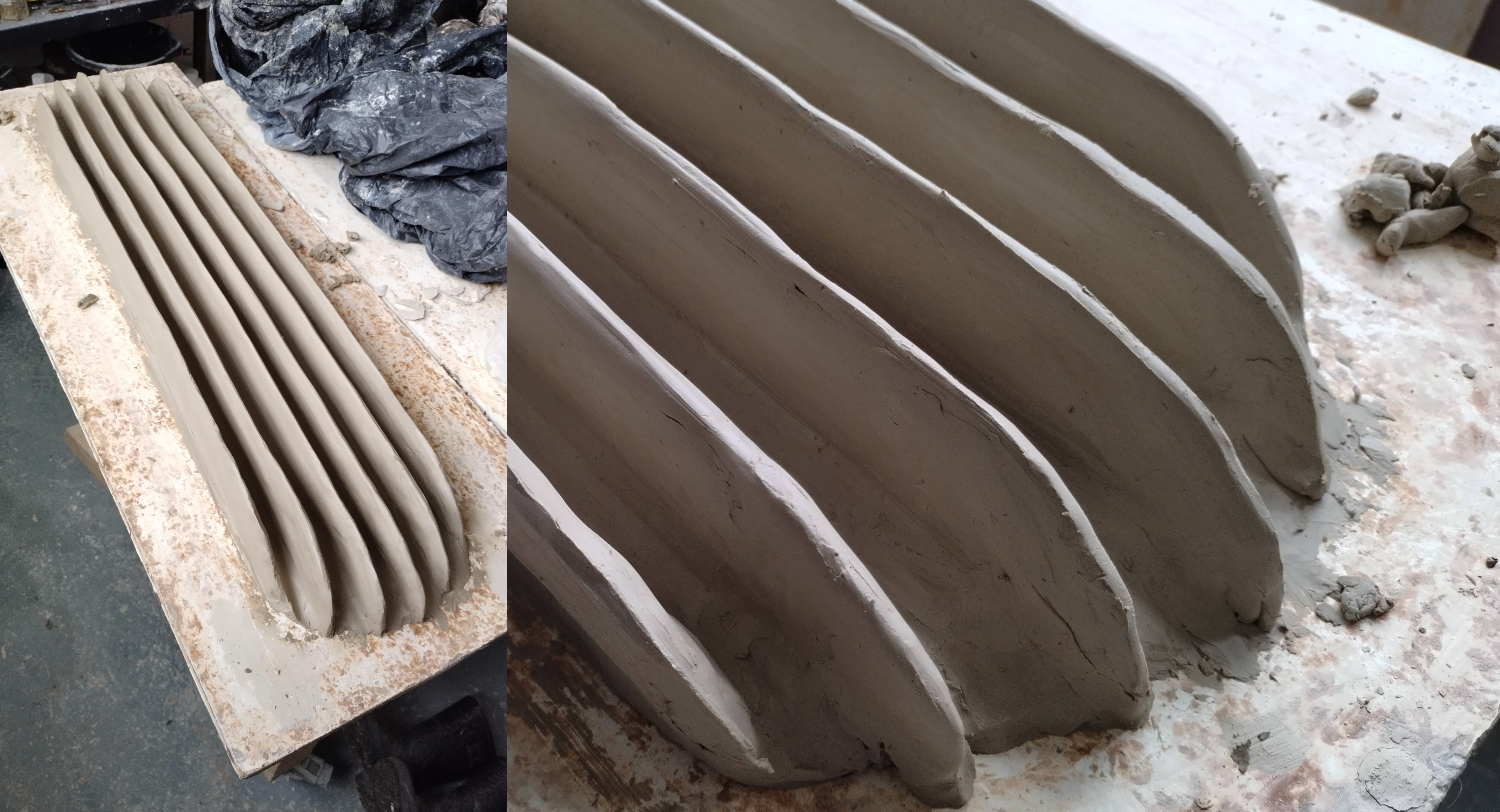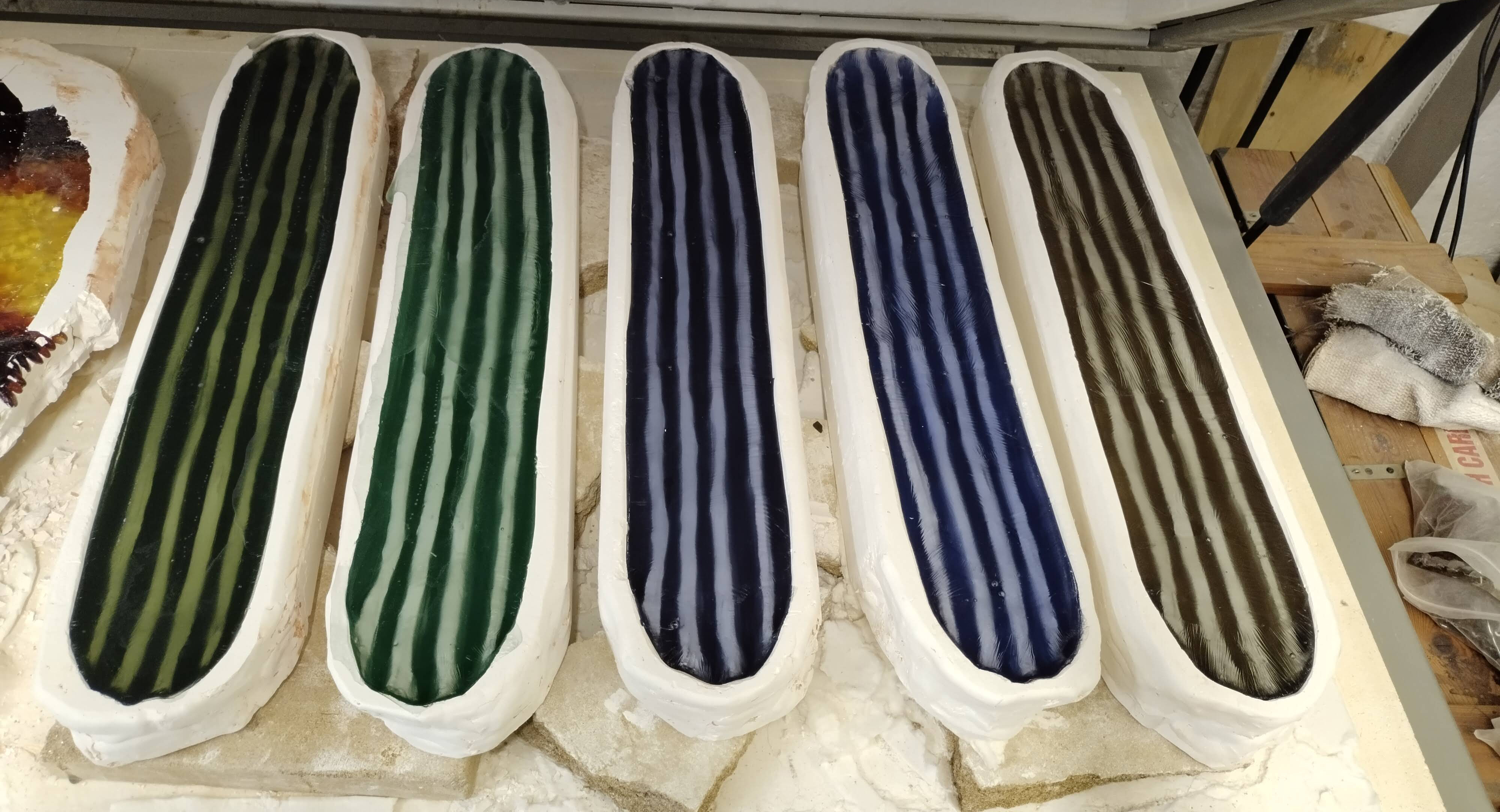 To explain a little about each step, I start with the more traditional techniques of kiln casting. After building a long-ribbed clay model, I create a mould and from this cast a wax version, which takes on all the details of its clay counterpart. The wax is then used to make my final lost wax plaster mould to cast my glass into. Using this process, I can create several waxes to cast from, hence each Twist having a similar start."