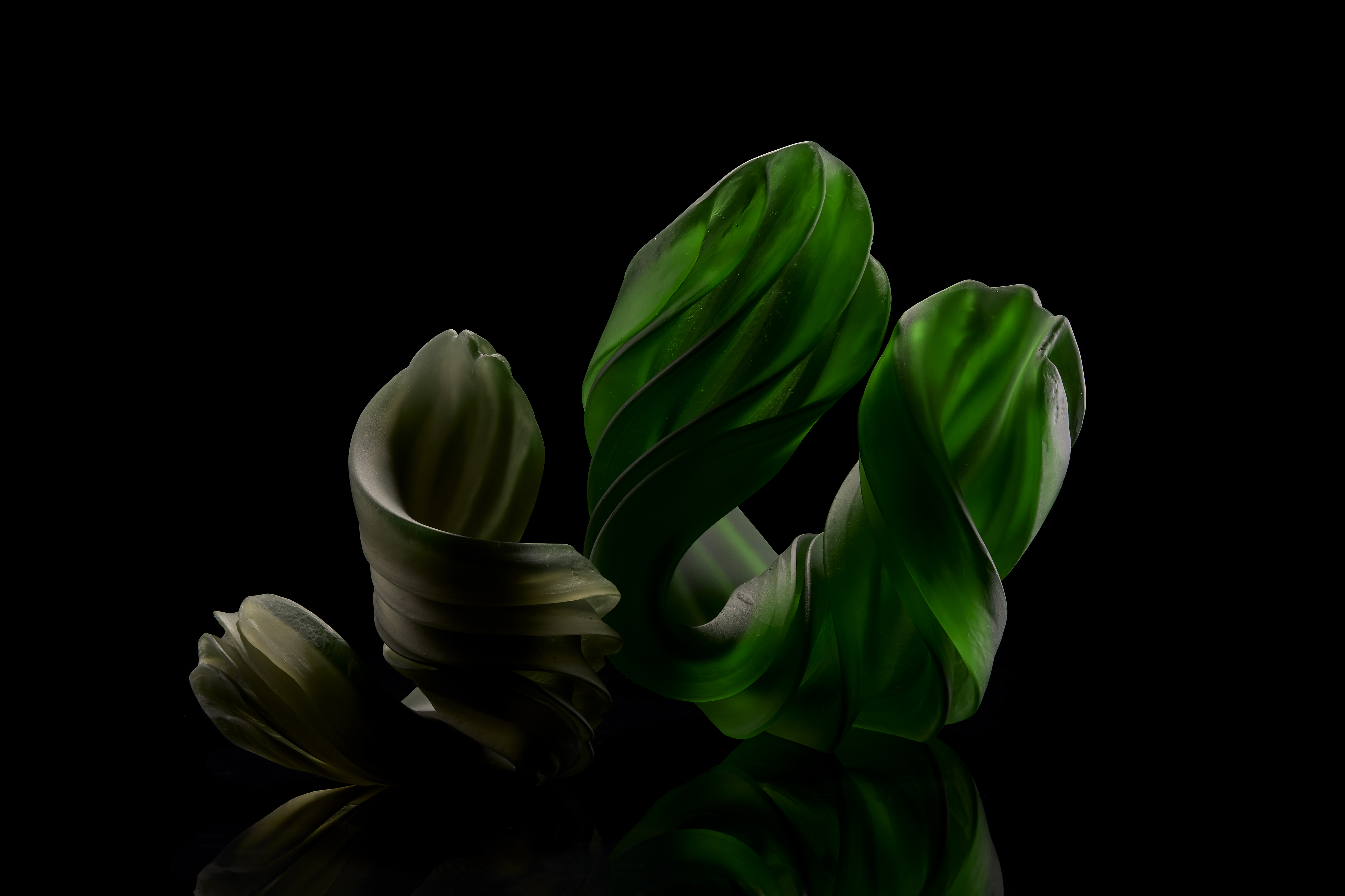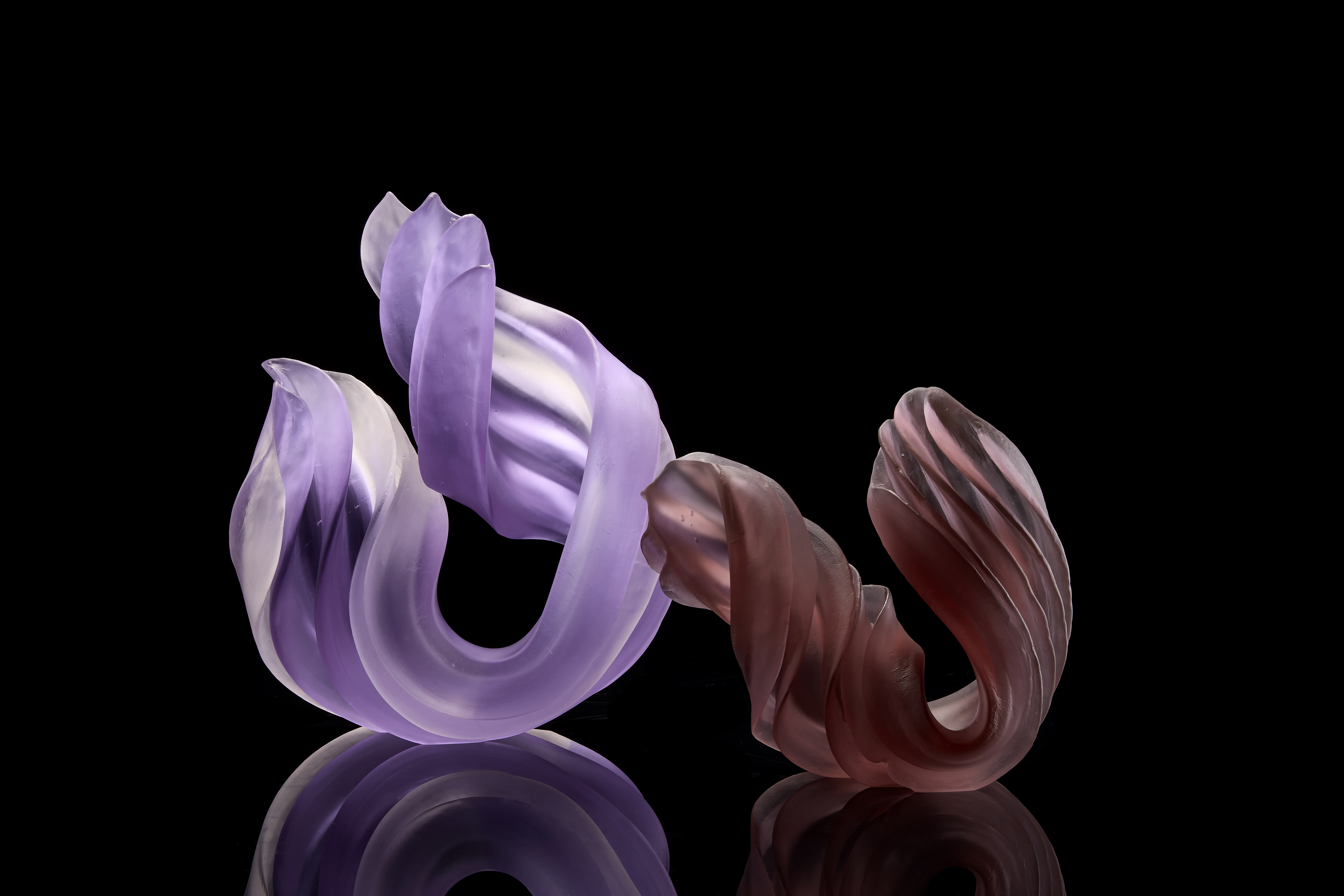 Starting with conventional techniques, yet unachievable without the experimental, each of Casson McGarva’s sublime sculptures commence with a solid prone ridged slab of cast glass, only distinguishable from another, by its colour. From here, via reheating with a fleeting moment to achieve her aim, Casson McGarva pushes, pulls and coaxes her glass to create her dynamic standing curling forms. Despite similar beginnings, once subjected to such maverick making, the end results are all Individual Twists.