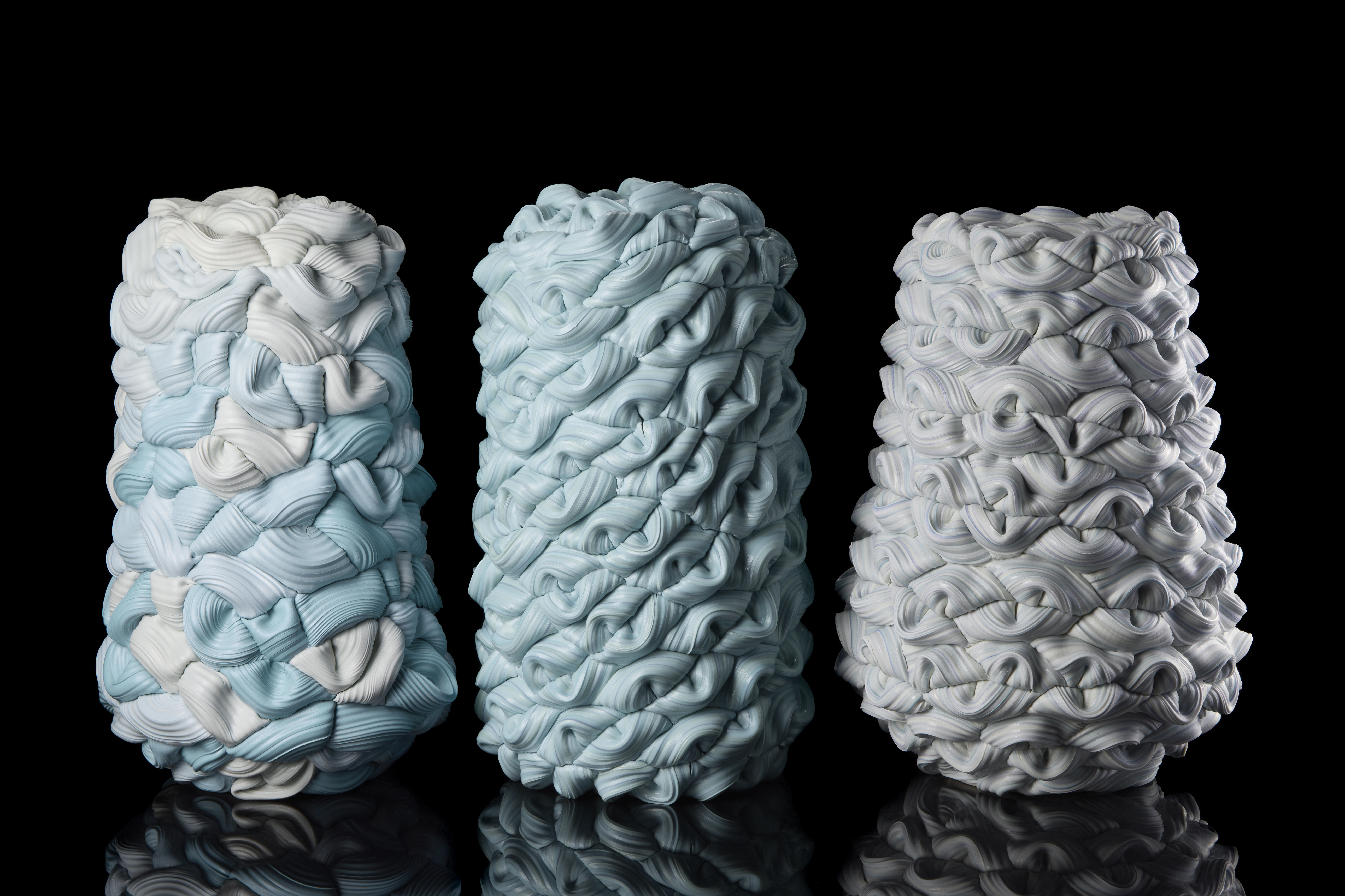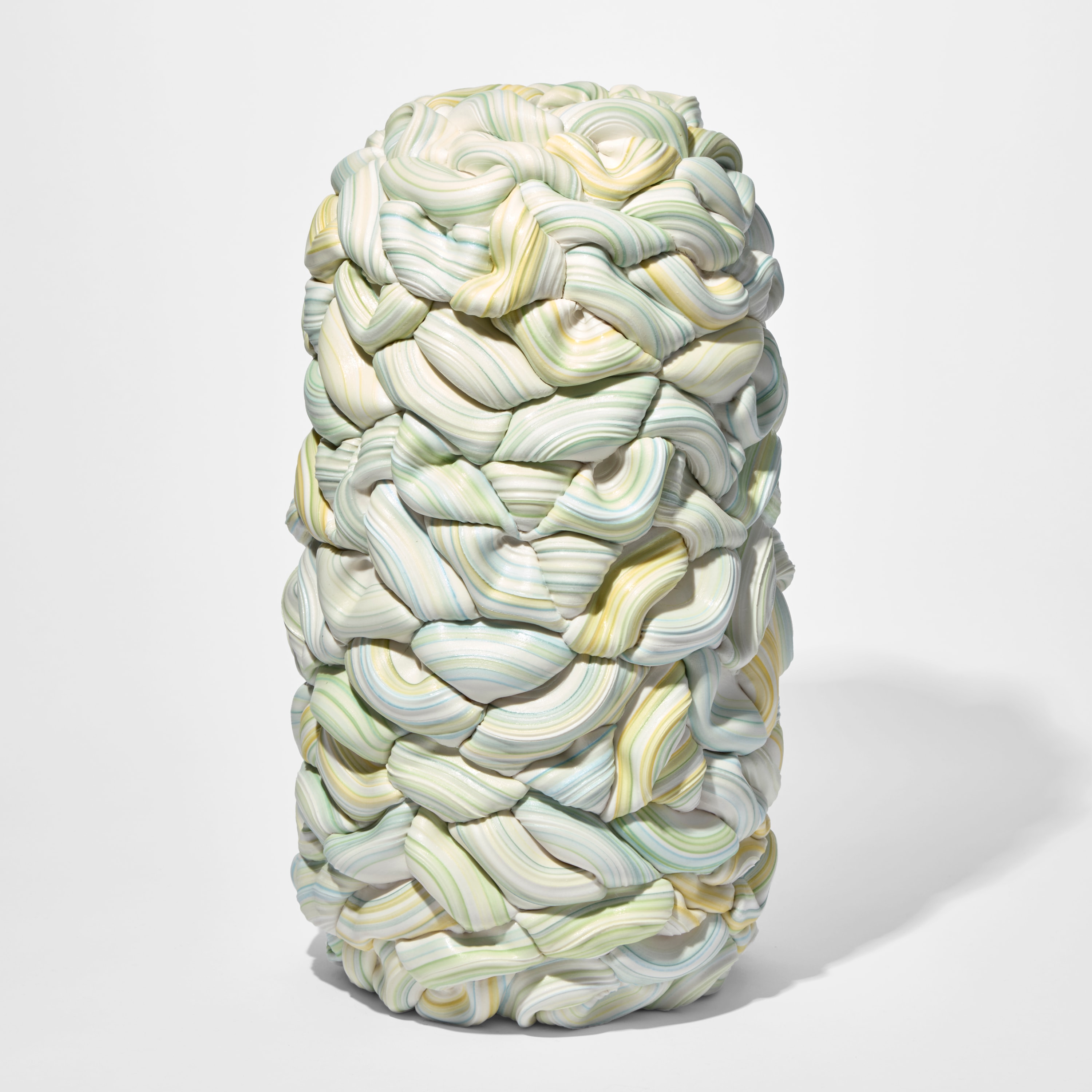 “Striped spheres thrown in parian and porcelain are halved and folded together to build a repetitive layering of pinched surface shapes to create this generous form. Each segment is detailed with a profile of lines that weave in and around the surface like the wrapping of textile or layering loops of rope. The surface is finished with satin sheen created from a wash of glaze during the final firing.”