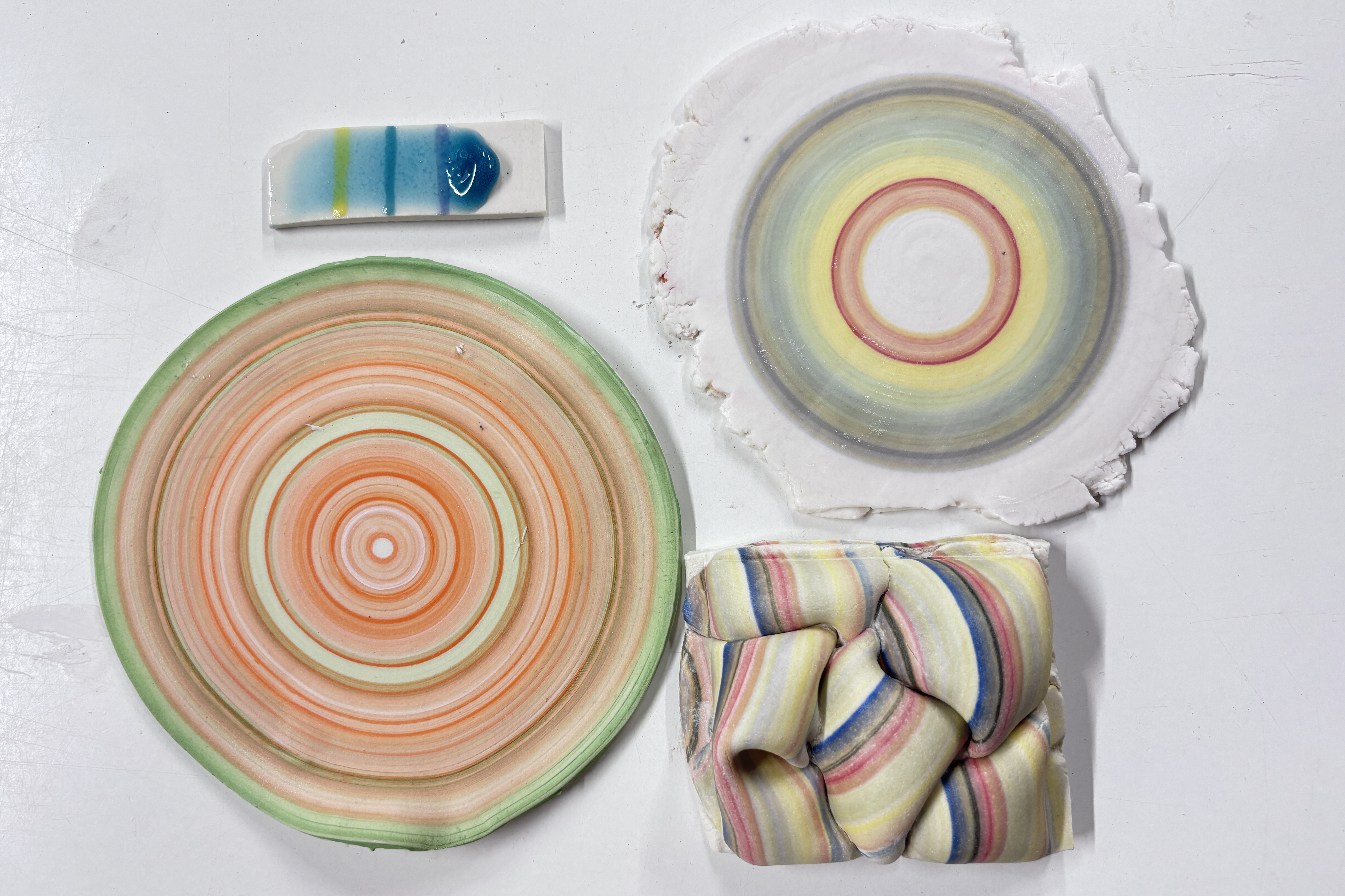 Whilst challenging and pushing his material to the limits, often using clay bodies in ways they are not designed for, Edwards purposely exploits unexpected results. Creating a sense of unease, during the making his clay cracks and buckles, resulting in permanent scars that illustrate the extremes that have been asked of it. Purely aesthetic, these fissures within the surface are an important counter point to the idealised, often confectionery sugary-hued, layered rings.