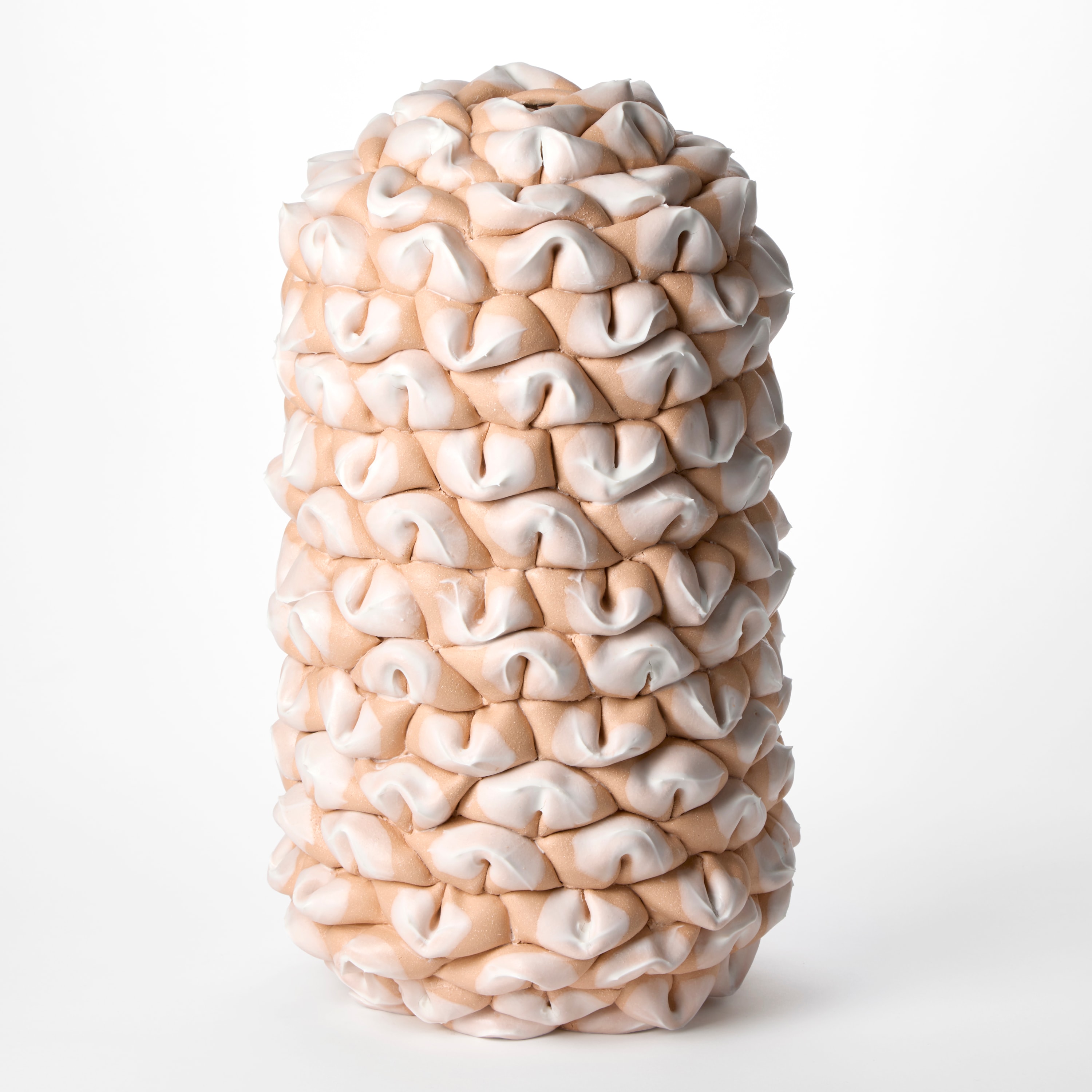 “Stoneware and parian clay spheres are halved and folded together to build a repetitive layering of pinched surface shapes to create this column-like form. They are partially immersed in parian slip, achieving a smooth, satin-like coating. The speed and duration of each dip influences the thickness. Careful attention is given to the separation of surfaces, where the final touchpoint is manipulated to form a concentrated peak, capturing a suspended moment in time.”