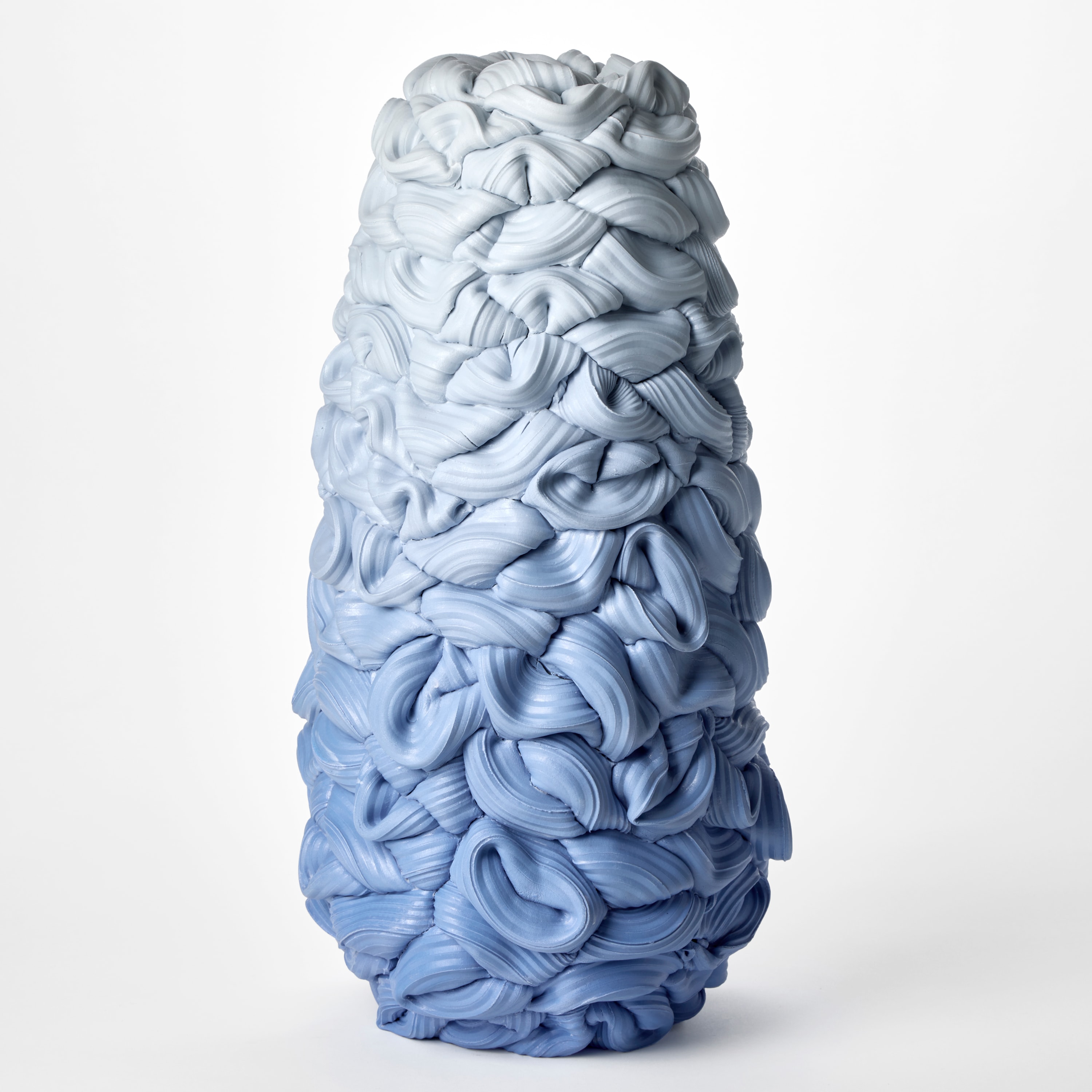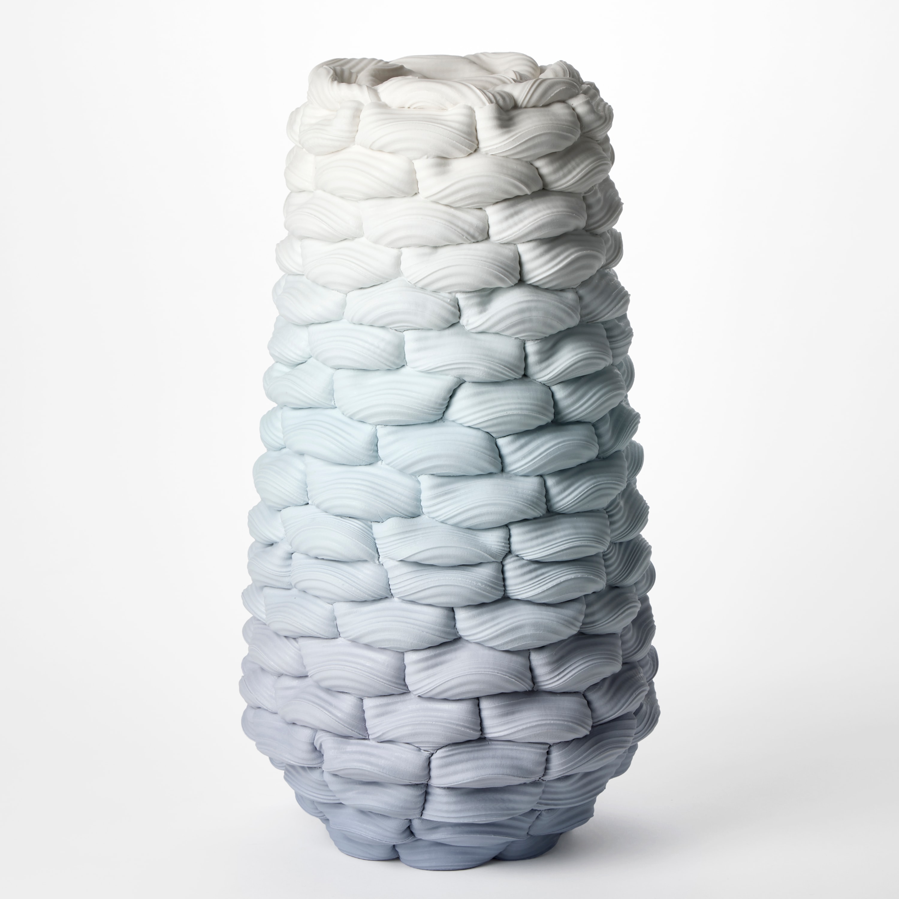“A blended gradation of purple, blue to white, rises up through this tall elongated form. Each layer is built on a grid of hollow cushioned folds that appear to relax into place like a wall of inflated segments. It’s puffy appearance has a satin sheen surface created from a wash of glaze during the final firing."