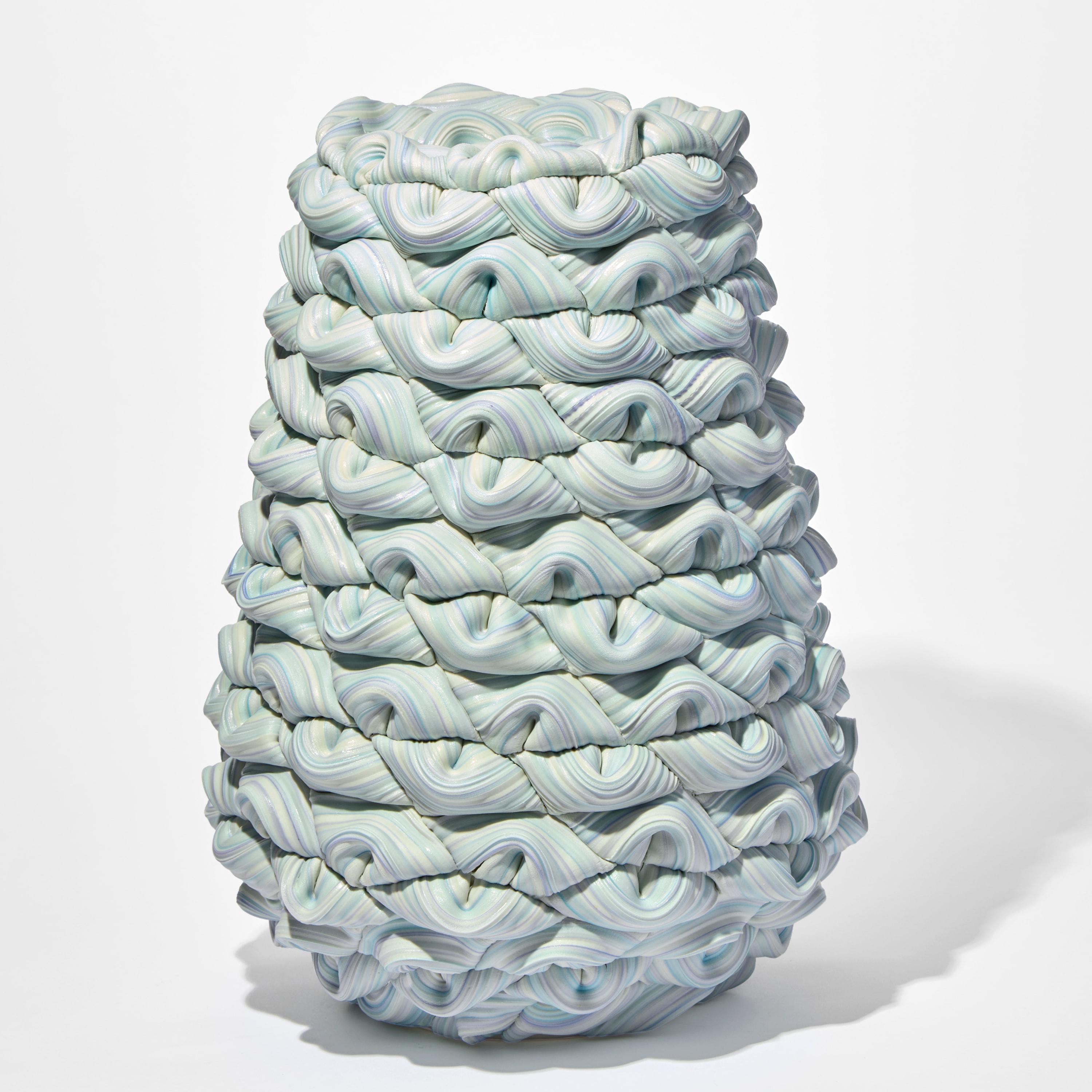 “Flaring at the base, this generous form is created from parian and porcelain clay spheres that are halved and folded together to build a repetitive layering of pinched surface shapes. Each segment is detailed with a profile of lines that weave in and around the surface like the wrapping of textile or layering loops of rope. The surface is finished with satin sheen created from a wash of glaze during the final firing.”