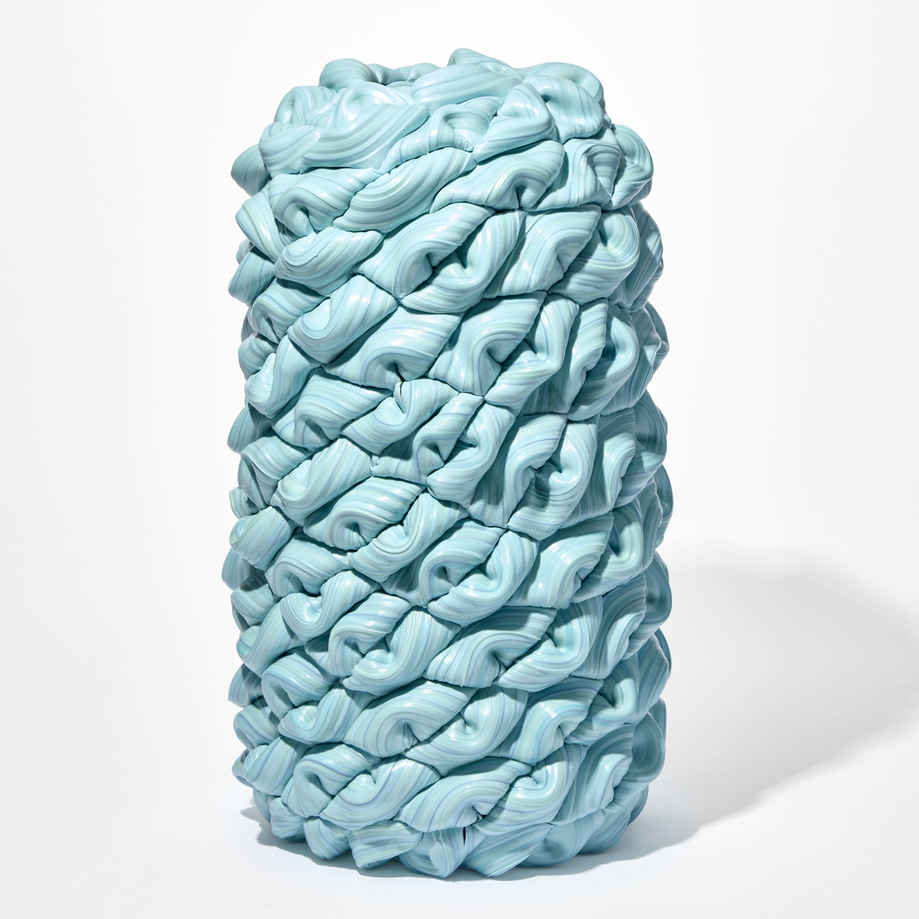"A tonal patchwork of turquoise and white is present throughout this stacked form. Each folded section is woven together, with the placement guided by responsive decision-making. I move between control and letting the creases, joins and attachments happen naturally. The overall form combines organic, soft transitions with rounded geometric shapes.”