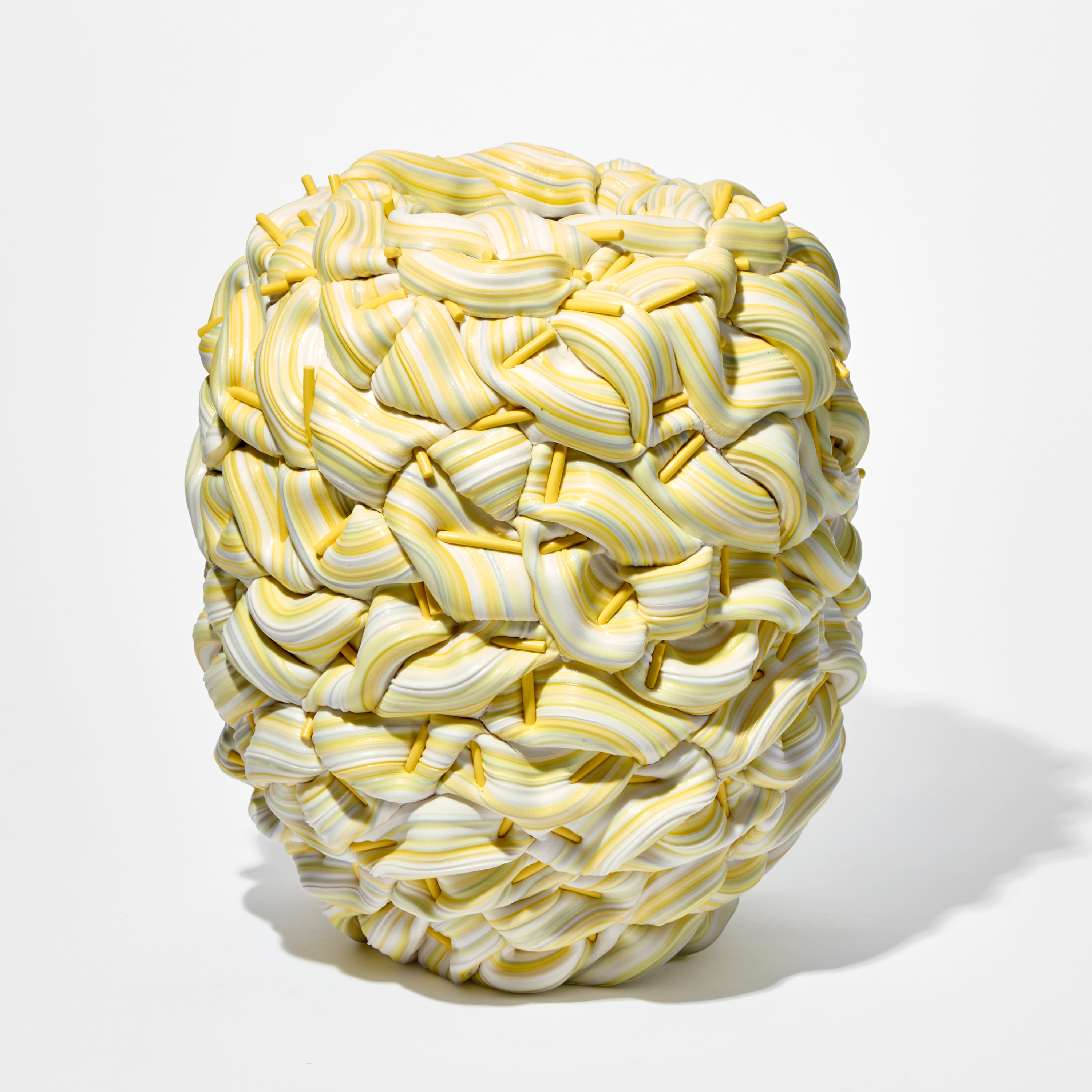 “Bright and bulbous, the form is wrapped with layers of ribbon like folds that are detailed with lines of colour. The surface weave is interrupted and influenced by short solid yellow rods. During the making, the folds take in and move around these added focal points.”