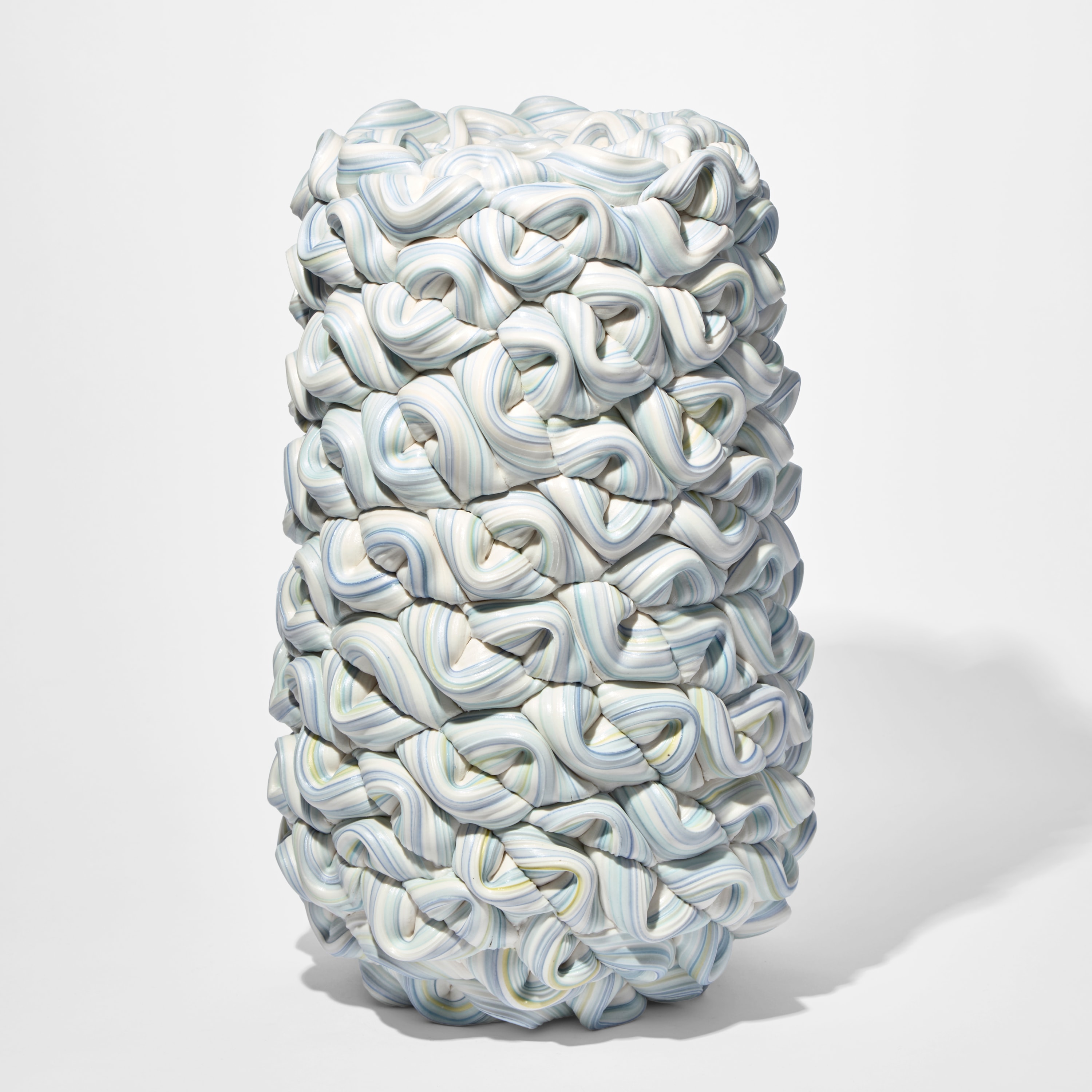 "Parian and porcelain clay spheres are halved and folded together to build a repetitive layering of pinched surface shapes. Each segment is detailed with a profile of lines that weave in a diagonal grid, in and around the surface like the wrapping of textile or layering loops of rope. The surface is finished with satin sheen created from a wash of glaze during the final firing.”